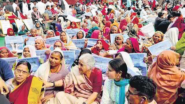 NEW DELHI: Hundreds of people on Monday marched to Delhi from different states and gathered at Jantar Mantar on the issue of Dalit rights and social justice. The people were carrying with them lakhs of signatures supporting a charter of demands addressed to the President of India, which included strict implementation of the SC/ST (Prevention of Atrocities) Act, distribution of land to the landless, ending of privatization of the public sector, revoking of the new education policy among other prominent issues. Talking to this correspondent, Subhashini Ali, ex-MP, said,