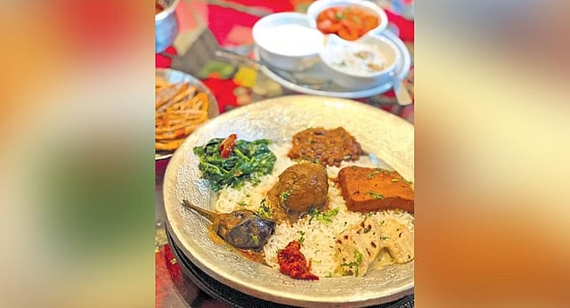 While Kashmiri cuisine is more meat-centric, for our afternoon, we picked their vegetarian ‘traami’ — a set meal. A traditional wazwan traami is a pre-plated meal where different dishes are served on a bed of steamed rice. Our traami came with steaming hot rice, lal paneer, dum olav (dum aloo), chokh wangun (khatte baingan), nadru yakhni, haaq, rajma and muj chatting (mooli chutney) — truly a kaleidoscope of flavours and a fine representation of the region’s cuisine.