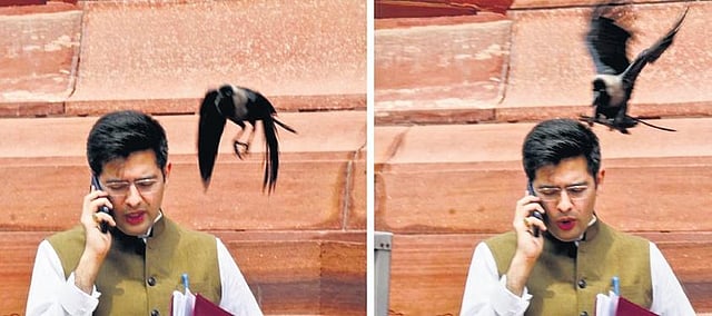 NEW DELHI: Photographs of a crow hovering over the head of AAP MP Raghav Chadha while he was speaking on the phone outside Parliament led to an exchange of jibes between the party and the BJP on Wednesday.
