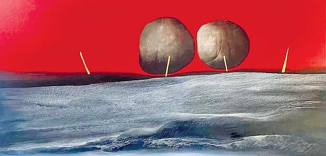 Among the many dimensions that the artist brings forth in the domain of landscape art, it is the evocation of solitude on canvas that is most impressive. Ask him to explain whether this perspective is a result of his artistic process over the years, and Sharma says, “I have been an avid traveller. My canvases are a reflection of unconscious observations of my subconscious mind.” Sharma unintentionally highlights how nuanced his understanding of contours remains when he shares, “All my works have been done at my studio without visual references, photographs or sketches.”