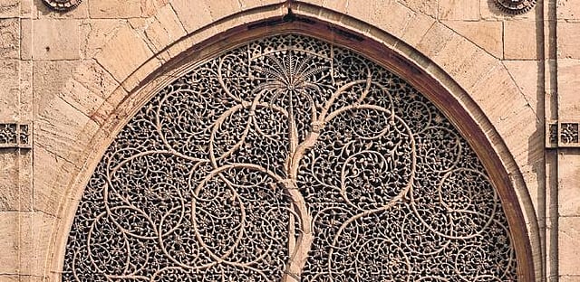 In historical structures, the jali may be carved in materials such as marble and sandstone, depending on the monument and the desired function of this feature. It can range from exquisitely carved elements - such as the ‘Tree of Life’ jalis in the Sidi Sayyid Mosque in Ahmedabad - to large-screen walls enclosing a sacred space in filtered light and celestially-inspired patterns - such as in the shrine of Sheikh Salim Chishti at Sikri.