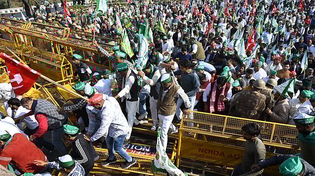 Farmers from Punjab, who announced the 'Delhi Chalo' march to Parliament demanding compensation and benefits related to agricultural reforms, including a legal guarantee for the Minimum Support Price (MSP), broke police barriers near the Dalit Prerna Sthal in Noida and began moving towards Delhi.