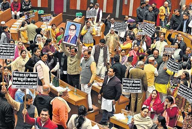 Councillors from the BJP and Congress stormed into the well of the House, climbed atop benches and displayed placards with slogans targeting AAP. Some placards read, “Illegal Rohingyas and Bangladeshi immigrants are AAP’s friends” and “Liar Kejriwal, shame on you.”