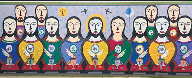 The embroiderer featured in Arpana Caur’s large painting with Warli folk motifs weaves the thread of her life in lines. The compositions in these works focus on the dualities of day and night, white and black, life and death, happiness and sorrow, fair and fierce.