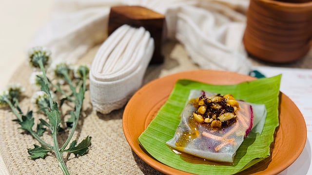 Sen gave a modern twist to her childhood favourites, based on the couple’s travels around the world. One of the dishes on offer was a ‘tento’ (the Bangla word for bitter) rice paper roll, which comprised bitter gourd in a Vietnamese roll, with a topping of peanut garlic chilli oil. In traditional Bengali meals, there is always a bitter element in a full-course Bengali meal, to set the palate for the courses to follow.