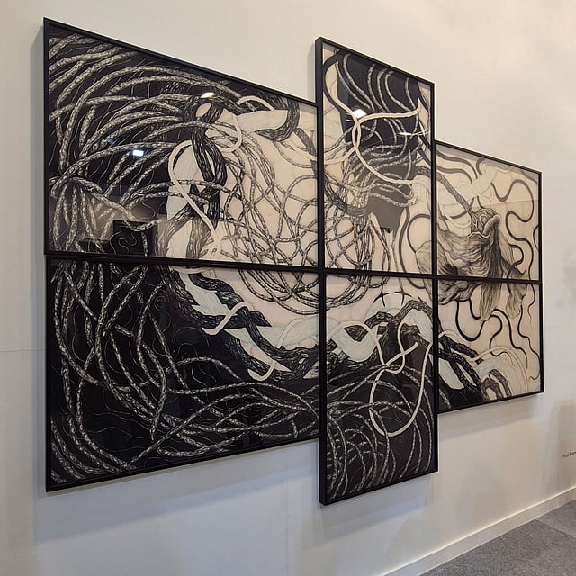 His drawings are primarily black and white, using charcoal and pencil — a medium he discovered during his BFA while experimenting with soot impressions from kerosene lamps and impressions of flowers and leaves. “Charcoal itself is a metaphor,” he explains. “It carries decay, growth, and transformation. It turns to dust, shifts, becomes something else — the drawing keeps changing. The medium is poetic and philosophical in itself.”