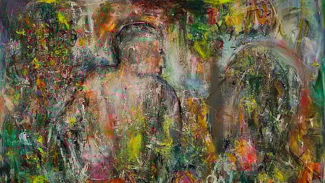 In one of the paintings titled, ‘What You Actually Are Never Dies’, the artist paints a field through thick impasto and a restless blend of deep greens, yellows, reds and whites, evoking memory and a feeling of inner turbulence. Two figures have also been drawn: one seen only from behind, gazing at the other, which nearly dissolves into the surrounding energy. Speaking of these shifting figures in his works, Satheesh says that nothing is fixed. “There is no birth and death,” he tells TMS. “It’s only a transformation … [in the end] only the essence remains.”