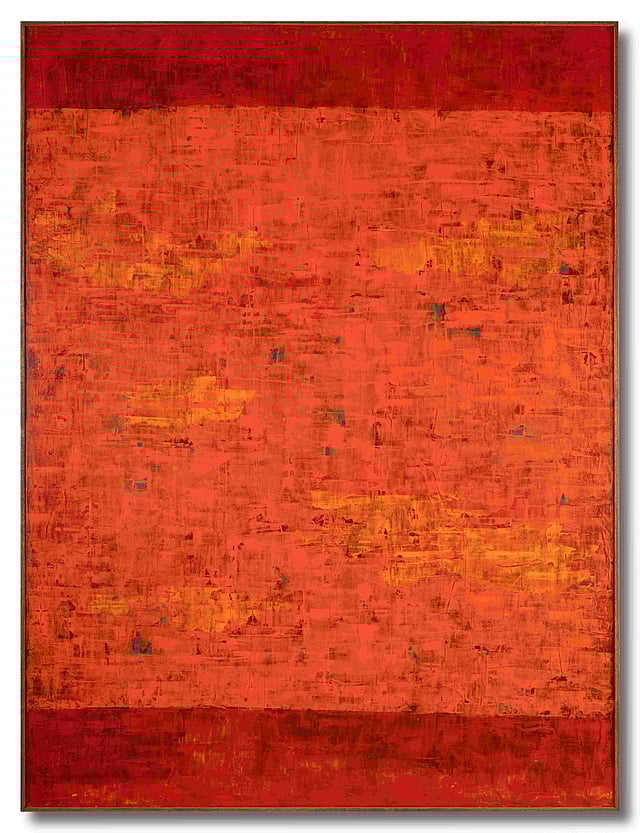 Using a palette dominated by reds, oranges, and ochres, Trehan creates surfaces that echo the desert’s undulating forms. Interestingly, she employs a rectangular metal sheet—or ‘patti’, commonly used to apply wall putty—to build layers and textures in her works.