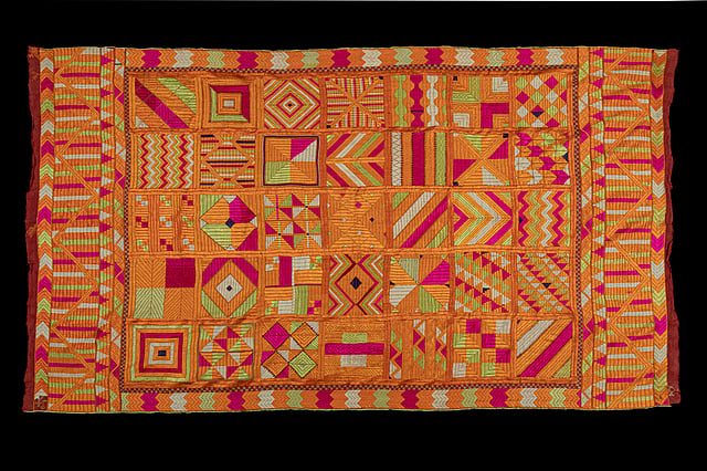 At Latitude 28 in Delhi’s Defence Colony, gallery director Bhavna Kakar is presenting a collection of over 40 rare pre-Partition Phulkaris and Baghs — the latter a ceremonial form of Phulkari made primarily for weddings and rituals. Unlike Phulkaris, Baghs (meaning “garden”) are heavily embroidered, with thick borders and densely packed geometric patterns that cover the entire surface of the fabric.