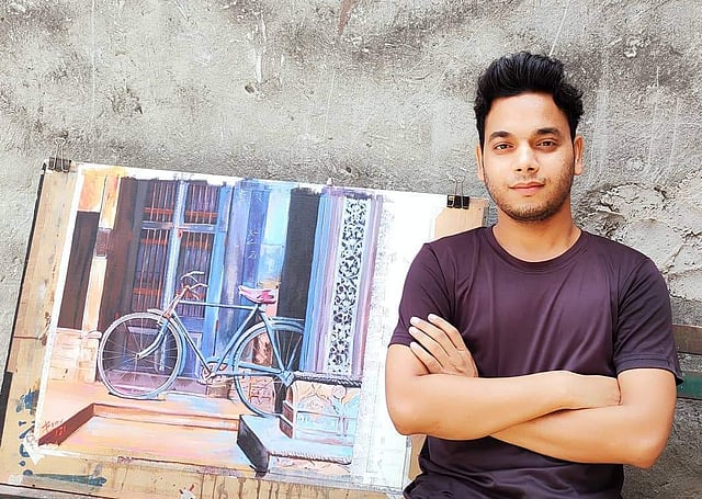 “The lanes of Old Delhi, the hustle and bustle there, the labourers, all of it really fascinates me. Ageing buildings, faded colours, the disappearance of old-style architecture, I want to capture them before they are gone,” he says. Busy Old Delhi markets like Fatehpuri, Chawri Bazaar, and Ballimaran market to dense, cramped alleys, teeming with crowds to rickshaw pullers and carts lined along the streets have all been the subject of his canvas for the past few years.