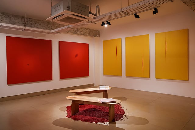 Born in Malaysia to parents of Andhra Pradesh and Kerala origin, Nahappan has spent most of her life in Singapore, where she is celebrated as one of Southeast Asia’s leading contemporary artists. Curated by John Tung, former curator at the Singapore Biennale and the National Museum of Singapore, ‘Chromatic Currents’ brings together some of Nahappan’s most defining works since the 1990s. Among them is ‘Dance of Surya’ (2004), three vermilion-hued canvases that travelled from Japan and Korea before arriving in Delhi. Across a plain yellow ground, Nahappan paints a single line of red—resembling sunrise or a sindoor mark—an ode to ancestry.