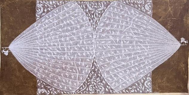 Mashe paints white, geometric figures, against a dark brown background. The Warli art itself is known for its depiction of daily life, plants, and animals. Traditionally, in this art form, a paste of rice and water is used to draw on mud walls.
