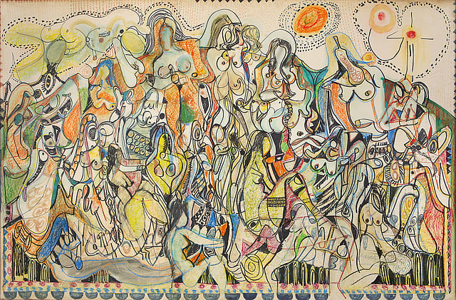 Chandra, on the other hand, internalised these tensions. His work moves away from figuration into abstraction, rhythm, and symbolic form. Sexuality is present, but it is folded into a larger visual language — what Tillotson describes as “bound up with lots of other things”. Bodies dissolve into landscapes, forms merge and repeat, and desire becomes metaphor rather than spectacle. Tillotson notes that both artists used sexuality as a route into inner consciousness. For observers, this was often racialised; for the artists themselves, it was simply a way of being.