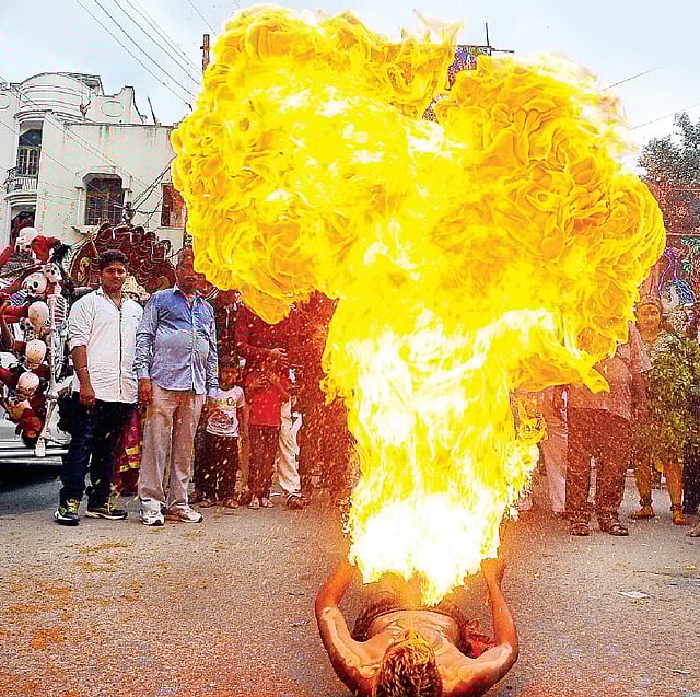 The procession led by the elephant had the mahout juggling with overhead wires as the man sitting on it threw prasad at passersby. At places where pedestals were set up, people threw flowers on the performers who were part of the procession. By the time, the procession reached Charminar it was dark but that didn’t deter the participants from showing off with renewed gusto.