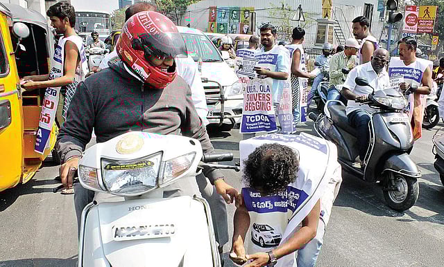 The cab drivers took to Jubliee Hills checkpost and and begged for money from public. They managed to gather Rs 450 within fifteen minutes before they were taken into custody. The protesters now plan to cook food next to Kukatpally forum mall as a part of their protest on Saturday.