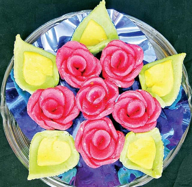 Sometimes cashew is also used as an ingredient and silver varq is added for a nice look. The sweet is presented in different and attractive designs, such as stars, flowers, betel leaves and even fruits. A variant is the ashrafi where the dough is pressed between two Nizami coins, to get the traditional Nizami inscriptions on the round golden coloured sweet resembling a gold coin.