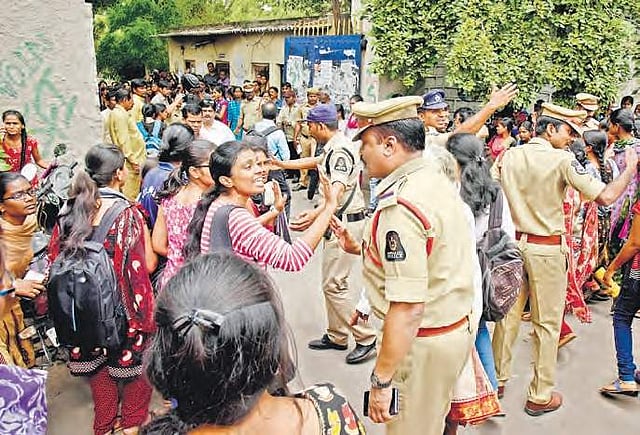 HYDERABAD: Hundreds of students from Koti Women’s College held an hour-long rasta roko protest demanding the rollback of Rs 2,000 fee hike, on Wednesday. The protest was called off after police intervened and promise to mediate. This is the second protest this week by the students over fee hike.