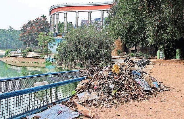 The untreated sewage aside, a visit to the park shows piles of garbage, scooped out of the pond, which seems to be lying there for days. A thick layer of algal bloom is also seen to be decomposing on the lake shore.