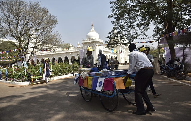 A bookseller takes around his mobile cart at the Hyderabad Literary Festival. | Vinay Madapui