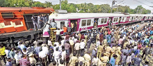 The only saving grace was that the MMTS train did not have many passengers and at the time of the collision, both the trains were moving at slow speeds.Yet, the impact sent shock through the train formation, toppling the coaches to parallel railway lines, and the coaches lay on the adjacent railway lines at grotesque angles. Imran, who arrived at the station to receive his brother who was on the Hundry Express said: “At about 10.30 am, the passengers felt a jolt and the train came to a halt. I could see passengers getting down hurriedly from the MMTS and running to safety.”