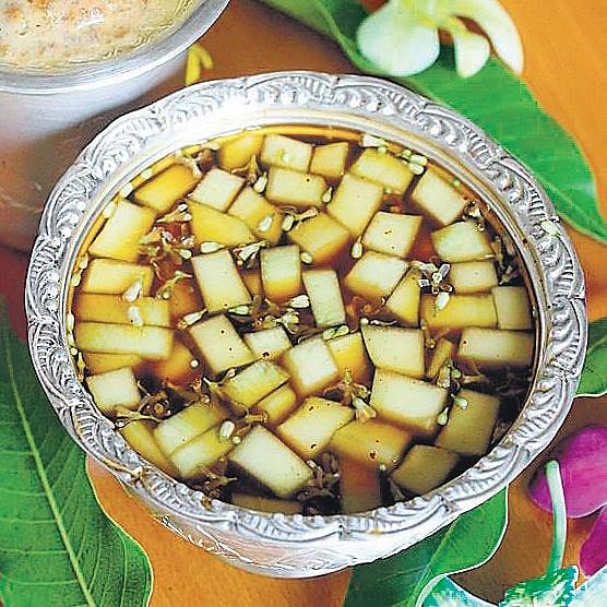 We never need an excuse to pile on the calories, and luckily, for us Indians, there is always a festival following the last to indulge us. The season brings a new harvest of fruits and vegetables, and what better way to celebrate than with a lavish feast? The venerable vegetarian buffet of Ugadi pachadi, atukulu payasam, boorelu, bellam garelu, semiya payasam, rava pulihora, pappu pulusu, vankaya batani, is unique to the culinary culture of the Telugu people. The pachadi is a dish of six different flavours that range from sweet to bitter.