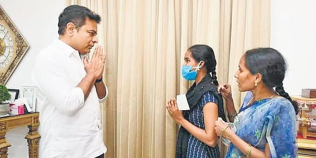 HYDERABAD: TRS working president and Minister KT Rama Rao on Thursday, July 8, 2021, extended financial help to the family of Aishwarya Reddy, a student who died by suicide on November 2, 2020, due to a lack of funds to pursue her online education during the Covid-19 lockdown.