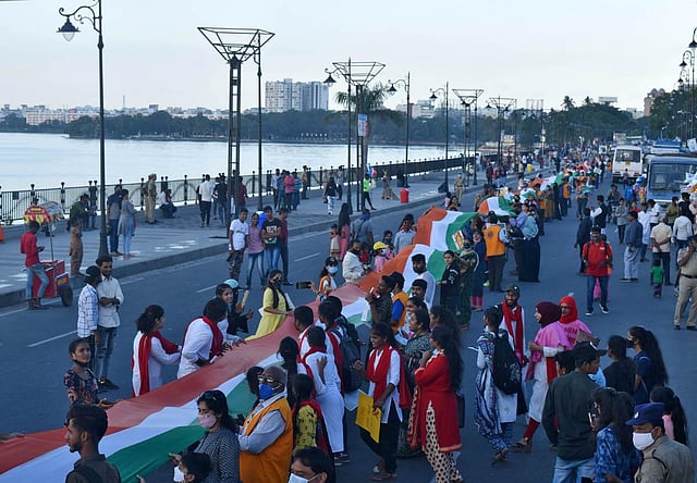 HYDERABAD: In a grand display of patriotism, nearly 300 Lions Clubs International members unfurled a one kilometre-long Tricolour on Tank Bund Road on Sunday to commemorate the 152nd birth anniversary of Mahatma Gandhi. A huge crowd, which was already present on stretch for Sunday-Funday, raised patriotic slogans.