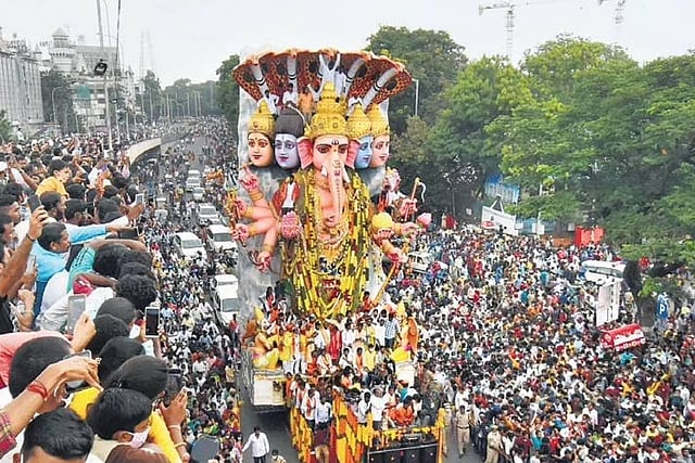 HYDERABAD: The 40-foot tall Ganesh idol, the tallest in the State, was immersed in Hussainsagar on the NTR Marg Road around 3.15-3.20 pm on Sunday. The immersion procession of the Khairatabad Ganesh idol began early on Sunday at around 8 am towards Hussainsagar, with chants of ‘Ganapati Bappa Moriya’. Devotees dressed in traditional attires watched as artistes wearing Bonam on their heads performed folk dance during the procession.