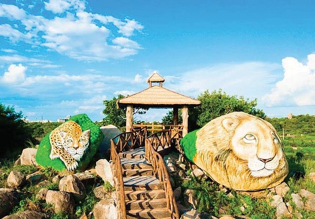 The total area of forest cluster in this park is around 450 hectares and the visitor zone is 90 acres -- 60 acres under Gajularamaram and 30 acres in Suraram. With its colourfully decorated entrance arch, compound wall painted with replicas of animals and water cascades, the park will a visual treat for the visitors.