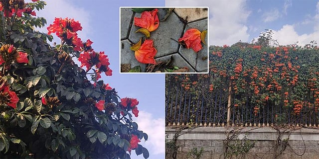 Spathodea or African Tulip tree, which is planted widely across the avenues in the city including a tree right in front of the entrance of Chief Minister’s Camp Office in Begumpet, is a classic example of tree which both blooms and retains chlorophyll. One can see that the tree has dark green leaves, with dust suspended upon it amidst flamboyant bloom.