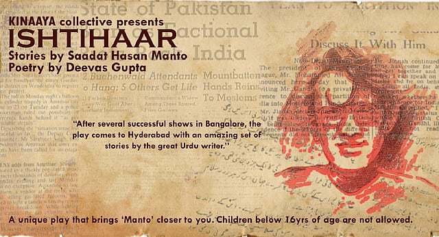 HYDERABAD: Kinaaya, a Bengaluru-based theatre collective, will be showcasing Ishtihaar for the first time in Hyderabad. The show aims to present a light-hearted version of Manto, who is typically associated with serious issues such as partition and sexuality.