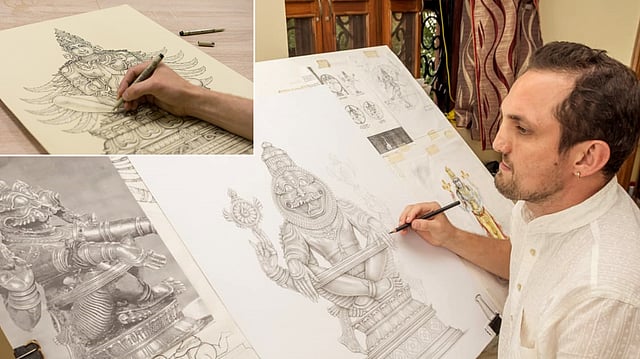 Today, the 42-year-old Drdha focuses on Hindu iconography and temple art and is the founder of Divyakala. He primarily works in the South Indian style that flourished during the Pallava, Chola, and Chalukya dynasties. His go-to mediums are pencil, pen, charcoal, and watercolour, but he also enjoys working with oil and acrylics from time to time.