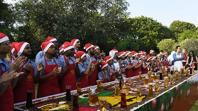 Our first stop was the iconic Taj Falaknuma Palace, where memories linger long after the festivities end. Escorted from the palace gates to the poolside garden in a buggy, we were treated to a ride through lush, breathtaking greenery. The garden, beautifully set up for the cake mixing, slowly filled with guests arriving in their festive best. The highlight of the afternoon was the collaboration with a Hyderabad-based NGO that supports specially-abled children, who also joined the celebration with radiant enthusiasm.