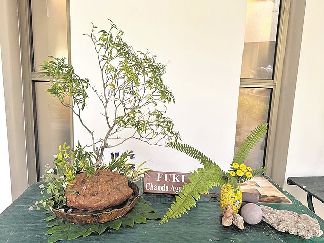 Nirmala Agarwal, president of the Ohara School of Ikebana Hyderabad Chapter, recalled how her journey with this Japanese art form began long ago. “I always had a love for plants, nature and flowers. Before I got into Ikebana, I would just walk around my garden, pluck some flowers and greens and put them in a vase on the table. Then my sister-in-law, who was into Ikebana, introduced me to it. Watching her do it caught my interest and I joined her teacher to do a basic course. I left it for a while but after two years, I joined Rekha Reddy, who encouraged me to get certified and more involved. For this piece, we were invited by Society to Save the Rocks. They wanted arrangements on the rocks, but since it was sunny and open, I suggested we place everything inside the hall and along the corridor as the material wouldn’t withstand wind or rain,” she shared.
