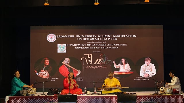 It was one of those magical evenings where anticipation itself became a melody, setting the stage for something extraordinary. The Jadavpur University Alumni Association, Hyderabad Chapter, presented ‘A Soulful Breeze’ at Ravindra Bharathi Auditorium, a concert that brought together four stalwarts of Indian music on one stage — Pt Ronu Majumdar, Pt Debashish Bhattacharya, Pt Tanmoy Bose, and Subhasis Bhattacharya. The result was a vivid tapestry of melody and rhythm that left the audience spellbound.