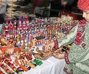 There is a wide variety of wooden handicrafts and furniture. From small traditional pooja rooms to tiny toys and wooden carvings made of teak and vengai, wall hangings, indoor decorations, animals and a large variety of deities, the fair has it all. Jaipur lac bangles are available in many colours and designs.