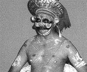 While narrating the story of Yayathi, Chakyar presented the subtle elements of mono act to portray the conversations that took place between the saint Shukra and his only one daughter Devayani. Through modulated tonal variations Kuttan Chakyar convincingly portrayed the characters like Sharmishta, Santhanu and his sweetheart Sathyavathi, Bheeshmar, Yayathi and his sons.