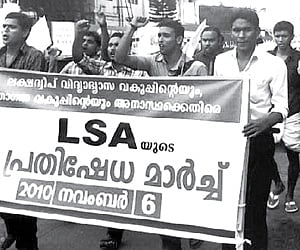 KOCHI: The Lakshadweep Students Association (LSA) took out a protest march to the Office of the Lakshadweep Administration here on Saturday demanding solution to various problems. The demands include sanctioning of the pending scholarships to Lakshadweep students in a time-bound manner, recruitment to various vacancies in the Education Department, making the ships to Lakshadweep sea-worthy and ensuring allotment to various courses in the beginning of the academic year itself.