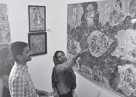 A freelance photographer by profession who was fascinated by the mythological characters, Aji Jayachandran’s ‘Narasimha Moorthy’, depicts an aggresive Narasimha while ‘Dhanwanthari Moorthy’ - the God of ayurvedic medicine and ‘Vishwakarmav’, the greatest architect, all show the artist’s detailing and the judicious use of mural colours. Sujatha Vinodsanker, a self taught artist’s paintings stand out for their bold touch of contemporary themes. Being a loyal Krishna devotee, her paintings portray Lord Krishna along with herself and her spectacles as a signature mark. “Krishna is not only with Radha, but the Lord is now with Sujatha too,” says the artist beamingly. In another canvas, the artist’s profound strokes has reproduced Lord Krishna’s key life events, beginning with his birth to death while in ‘Vasthrapaharnam’, she has depicted the mischievous Krishna who steals clothes of gopikas. Pramod Neelakandan’s awe-inspiring piece titled ‘Vinayaki’ is a unique blend of Lord Ganapati in a dancing posture adorning feminine curvaceous features and his ‘Venugopalam’ and ‘Ananthasana Vishnu’ shows the unending passion of the artist for mural painting.