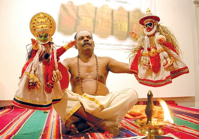 In Kochi, for an event organised by travel company Blue Yonder and designer Lakshmi Menon’s Ammumathiri, Ramakrishnan stands out, dressed in a simple mundu and the Basmam applied vividly on his forehead. Soon, he demonstrates how he manoeuvres the fingers to bring his Kathakali puppets to life.