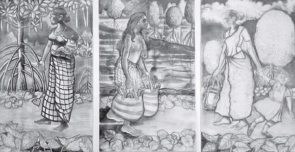 A major characteri stic of his paintings is, they are unnamed. His charcoal paintings focus on people who struggle in life. In one of his acrylic paintings, Ashanthan attempts to portray life as he has experienced it. The artist has portrayed what happens after death. It seems the artist wants to say that no matter what kind of death one faces, he or she will go to the other side of the realm like everybody else.