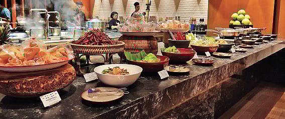 Apart from the six food carts that do more than enough to please your appetite, the indoor restaurant, with two live counters, will spoil you with options. The buffet is extensive with at least eight varieties of starters, of which laab hed, a spicy chewy mushroom salad with mint and spring onion and goong tord grob, surprisingly moist deep-fried prawns are worth mentioning.