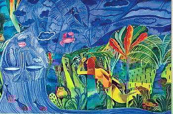Subodhkumar’s watercolour drawings are effortless, like a casual note he wrote about the world around him. “The lonely singer, a woman gazing away into a distance—these are all things I have seen through my journeys by train or road. If the moment excites me, I paint it out,” says the artist. Two black ink on paper drawings at the center of the exhibition is an impressive juxtaposition amidst all the colours offered by Thadhaagatha.