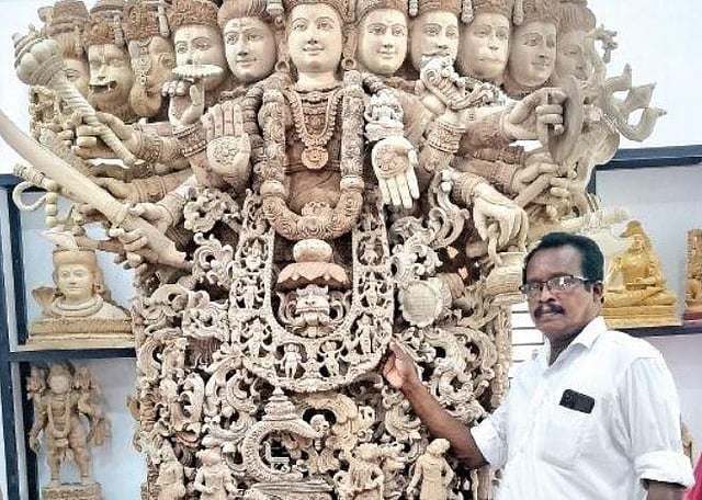 Nagappan, who has been making sculptures using ivory, sandalwood, teak and rosewood for over 40 years, claims that this Vishwaroopam would be one of the tallest and unique wooden artefacts. The sculpture is being made from whitewood with around 80 per cent of the work completed. The imposing structure has 11 heads, 22 hands holding various weapons and around 400 carvings which depict different characters of the epic.