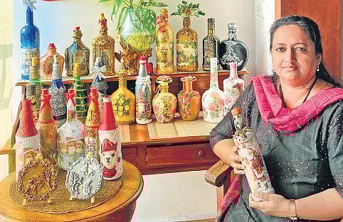KOCHI: When her responsibilities in life eased, Bessy George decided to dust off her passion for art. After perfecting her glass painting skills, pottery decorations and clay art, the Ernakulam-native recently ventured into bottle art. Glass bottles in intricate clay detailings, embellishments and jute wrapping, plunged in vibrant colours are lined up at Bessy’s residence. Her newest interest, ‘decoupage’, can also be spotted among them.