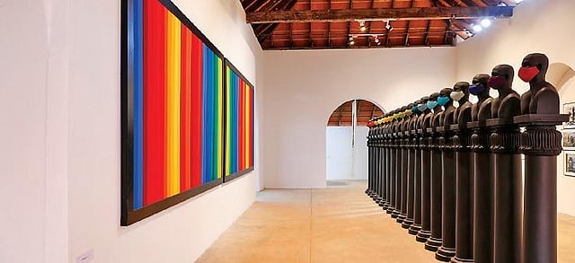 Now, in 2021, at the Lokame Tharavadu exhibition, he has displayed his fully developed work, ‘Spectrum — Dear Mr Ellsworth Kelly & Others’. The 23 ft-long diptych, uses 99 shades of fabric spools he sourced from a textile shop in Alappuzha. Facing it is an installation titled ‘Left to Right: Fragmented 19: Fragmented Spectrum (Masks); Remaining 19 in the article’. Each of the 19 pillars, with masked busts of the artist himself, is 7.3ft tall.