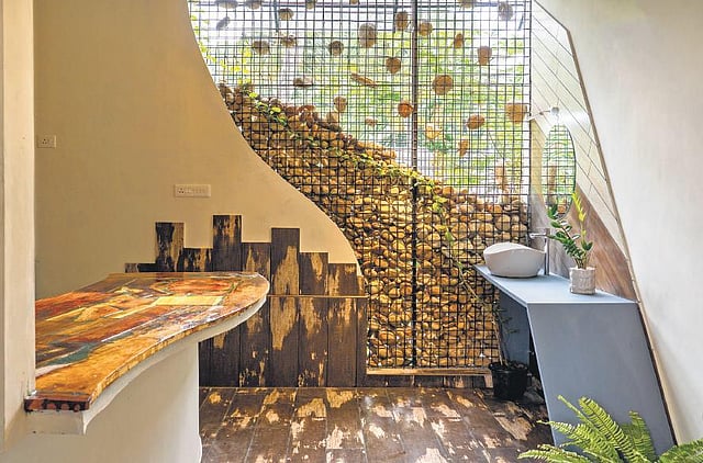 The bamboo window is another added attraction. One can tilt the bamboo pieces to create a privacy screen. Left-over tile pieces are integrated into the wash area. The adjoining pebble wall makes for a niche space filled with creepers. “It is a gabion wall set up usually as compound walls,” says Neeraj. Oxide is used on walls to ward off the chemicals in the paint. A blue and green oxide wall makes the kitchen area colourful.