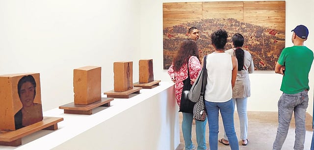 The main installation includes images of his ancestral home and an aerial Google Maps view of the village printed on teakwood. Another one has earthen bricks on which the images of his ancestors have been printed. “The entire place holds a lot of stories,” says Saju, an alumnus of the Government College of Fine Arts in Thrissur.