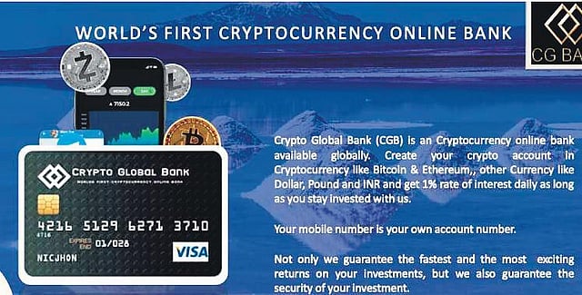 Police have already launched a probe into the activities of the racket that push the brochure and prospectus of the bank through WhatsApp groups to lure more people. The brochure reads: “CGB is the world’s first decentralised cryptocurrency online bank.