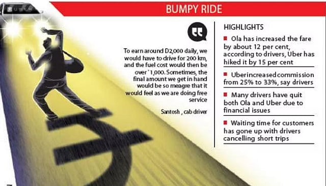 Drivers with Ola, however, seem to be slightly better off. “For instance, if I get `2,500 in a day, I would be left with Rs 1,500 in hand after all fuel and commission costs. In case of Uber, the in-hand amount would be only around Rs 1,000,” says Anand (name changed).